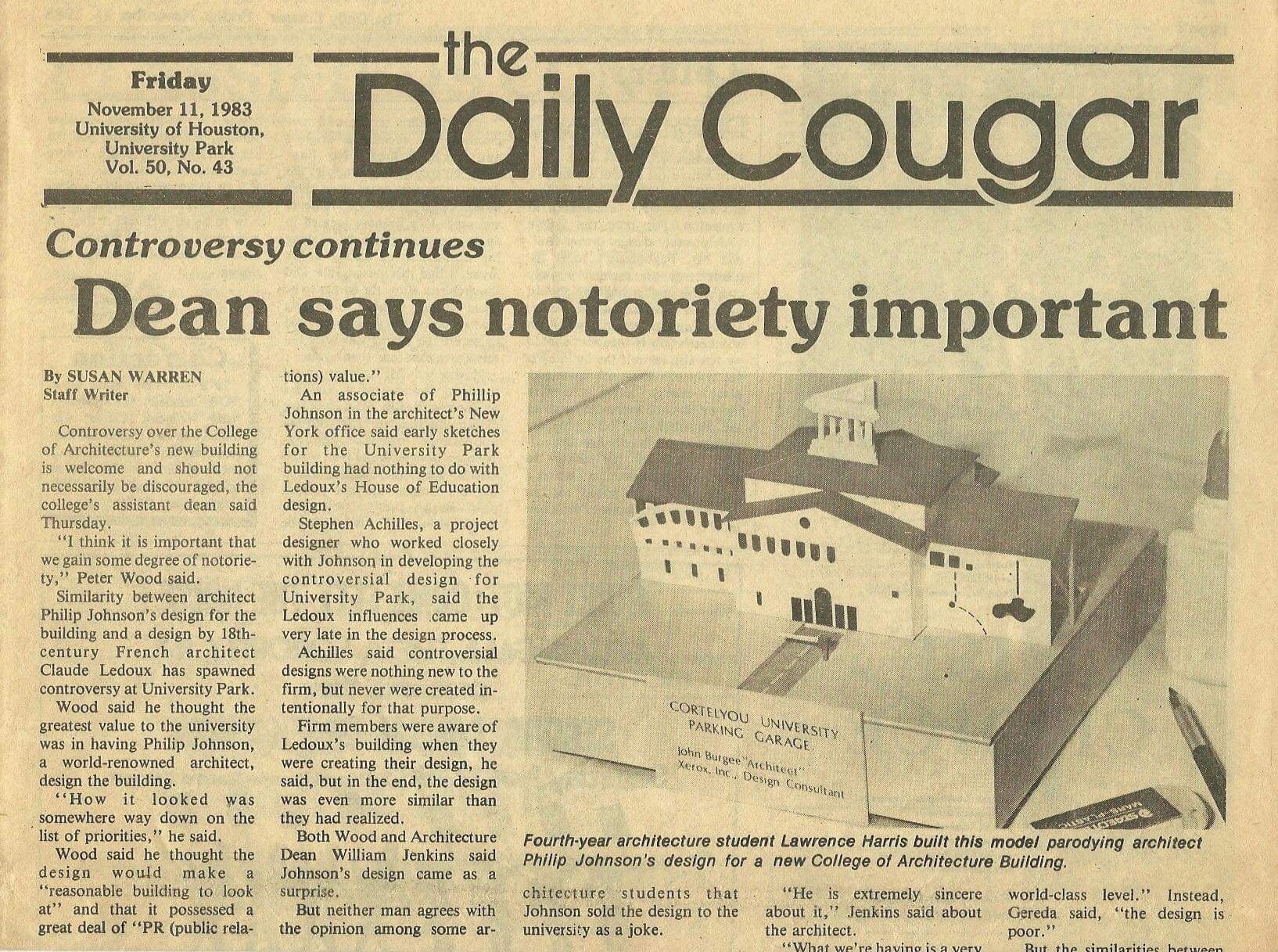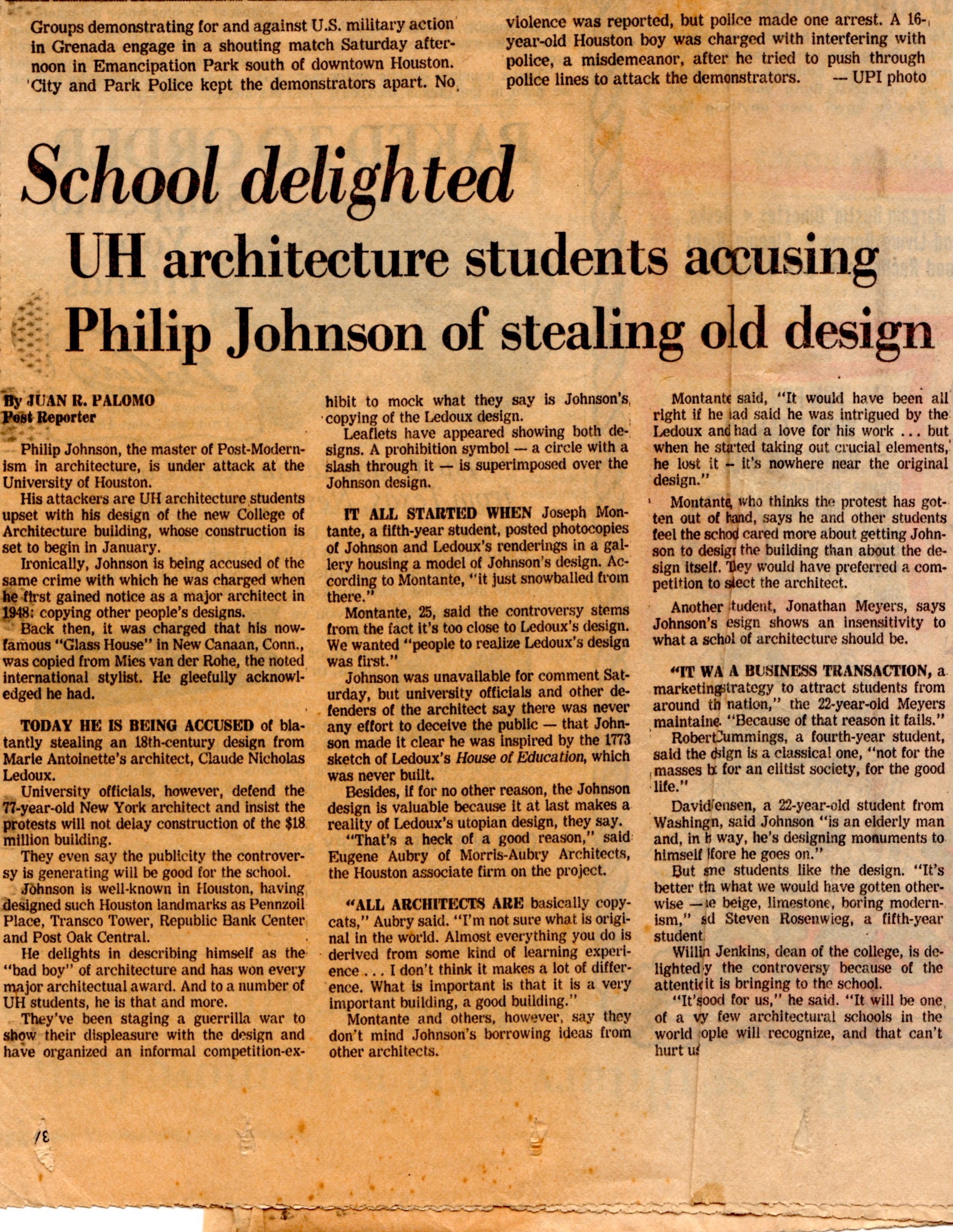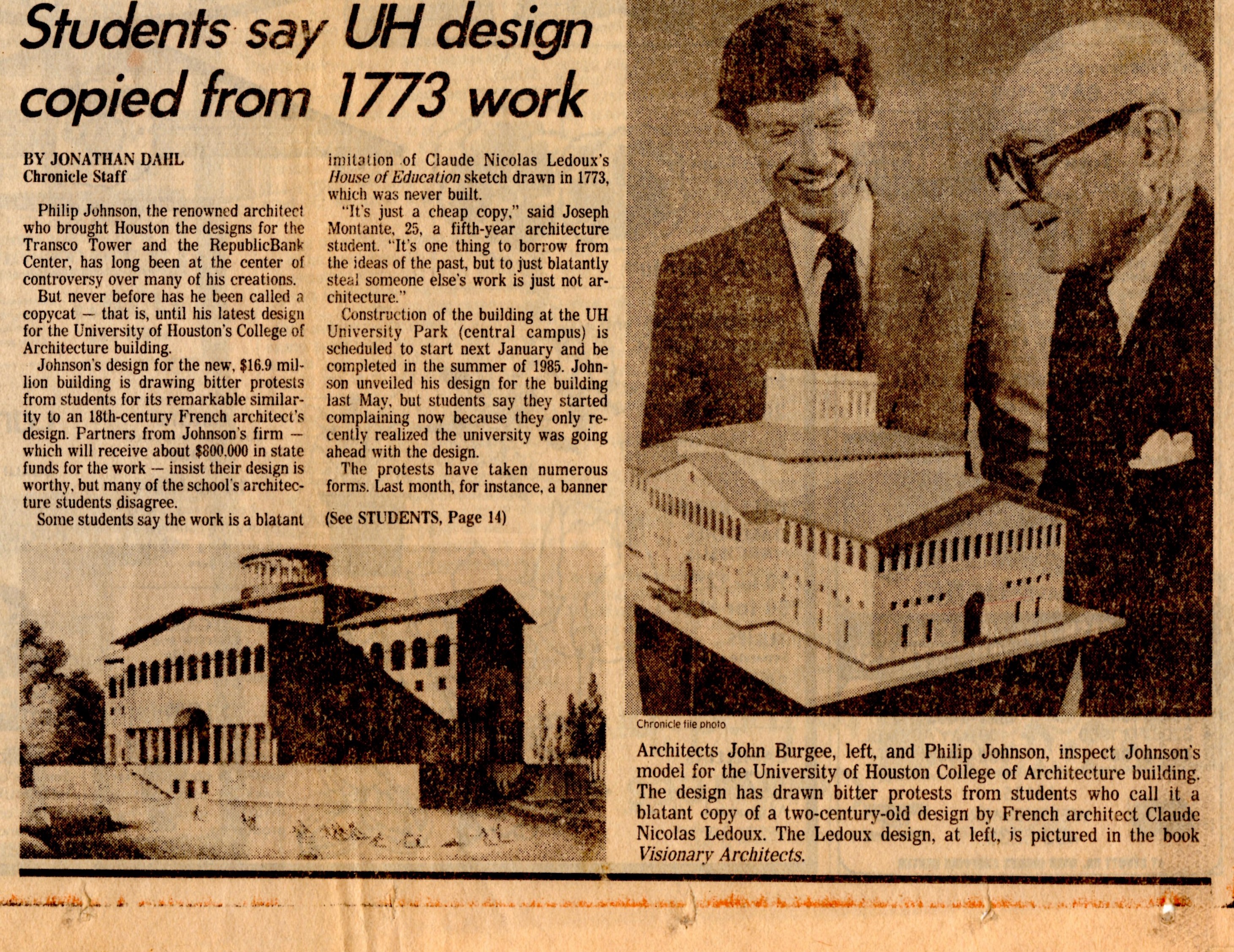 Oh to be young and full of idealistic views again. In 1983, Philip Johnson was the Post Modern Movement’s bad boy and we the Architecture students at the University of Houston fervently protested his plagiarized design for the new School of Architecture. We felt Houston should know Ledoux came first…Below is a mix of items from that time with the drawings and designs being a mix of student work I just happened to have on hand digitally…